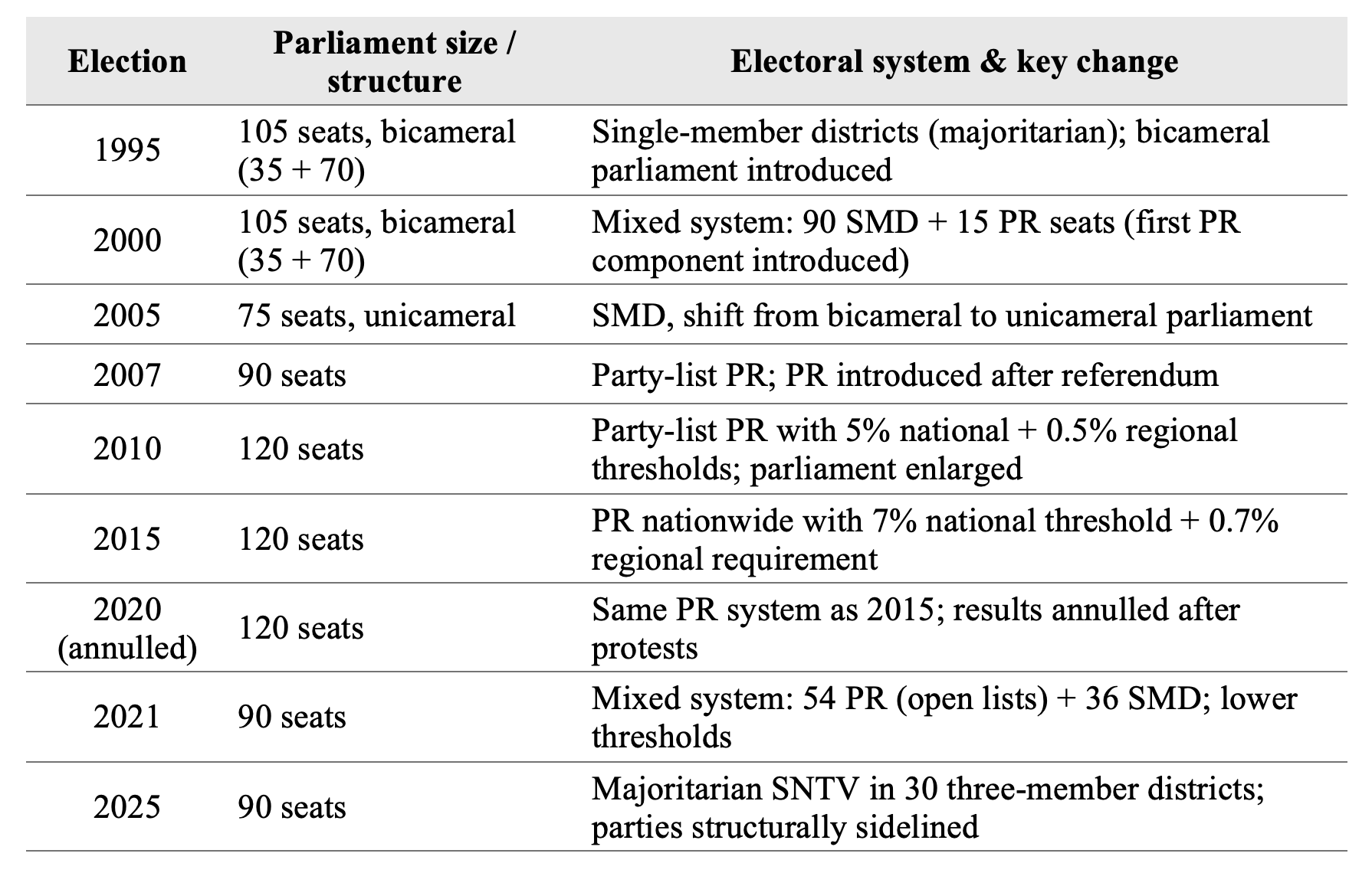 The November 2025 elections represented yet another major redesign: a full transition to a majoritarian electoral model based on multi-member districts. In one sense, this marked a return to familiar territory – district-based majoritarian elections were used in 1995, 2000, and 2005. At the same time, the reform introduced an important novelty: the adoption of the SNTV system, under which each of 30 constituencies elected three parliament members.